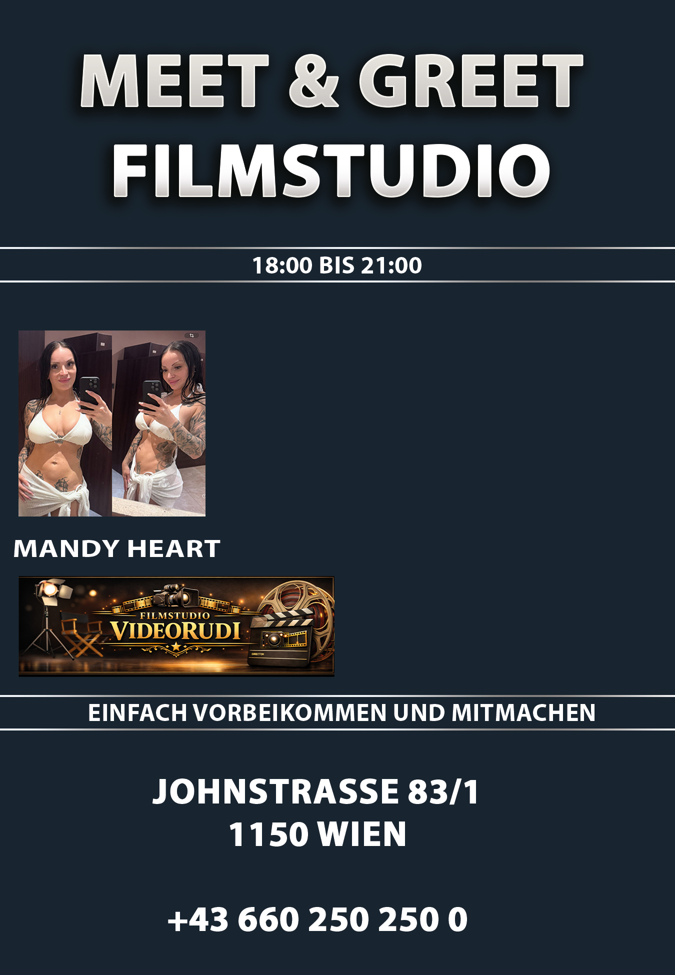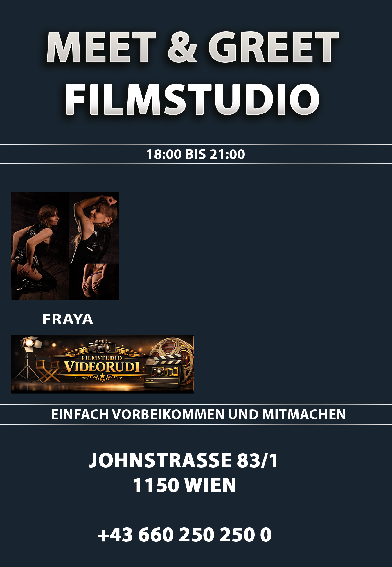 🎬 Jeden Dienstag von 14-17 Uhr Videodreh im Filmstudio Videorudi Heute mit dabei sind: 🔶🔶 VIP Doppel-Ticket 🔶🔶 Für unsere anspruchsvollsten Gäste präsentieren wir eine neue, besonders exklusive Möglichkeit, das Filmstudio in seiner ganzen Vielfalt zu erleben:das VIP Doppel-Ticket. Dieses Ticket wurde für alle geschaffen, die mehr Nähe, mehr Zeit und mehr Erlebnis erwarten – ohne Kompromisse. Drei exklusive VIP-Optionen stehen dir offen:      🔶 Videodreh & Meet & Greet an einem Tag Vom Set direkt in die persönliche Begegnung – ein kompletter VIP-Tag im Filmstudio.      🔶 Videodreh am Dienstag & Videodreh am Donnerstag Zwei Drehtage, zwei intensive Erlebnisse, maximale Nähe zur Produktion.      🔶 Meet & Greet am Dienstag & Meet & Greet am Donnerstag Zwei stilvolle Abende in entspannter Atmosphäre – exklusiv, diskret, persönlich. Unabhängig von deiner Wahl erhältst du zwei Premium-Zugänge zum VIP-Gesamtpreis von nur 99 Euro. Doppel-Ticket ist im Studio erhältlich. Warum du dabei sein solltest: Es gibt Räume, die du nur betrittst, wenn du bereit bist, ein Stück Neugier mitzubringen.Dienstags öffnet sich im Filmstudio eine Tür, hinter der ein ganz besonderes Erlebnis auf dich wartet – eine Creative Studio Erfahrung, die du so schnell nicht vergisst. Wenn du bereit bist, für einen […]