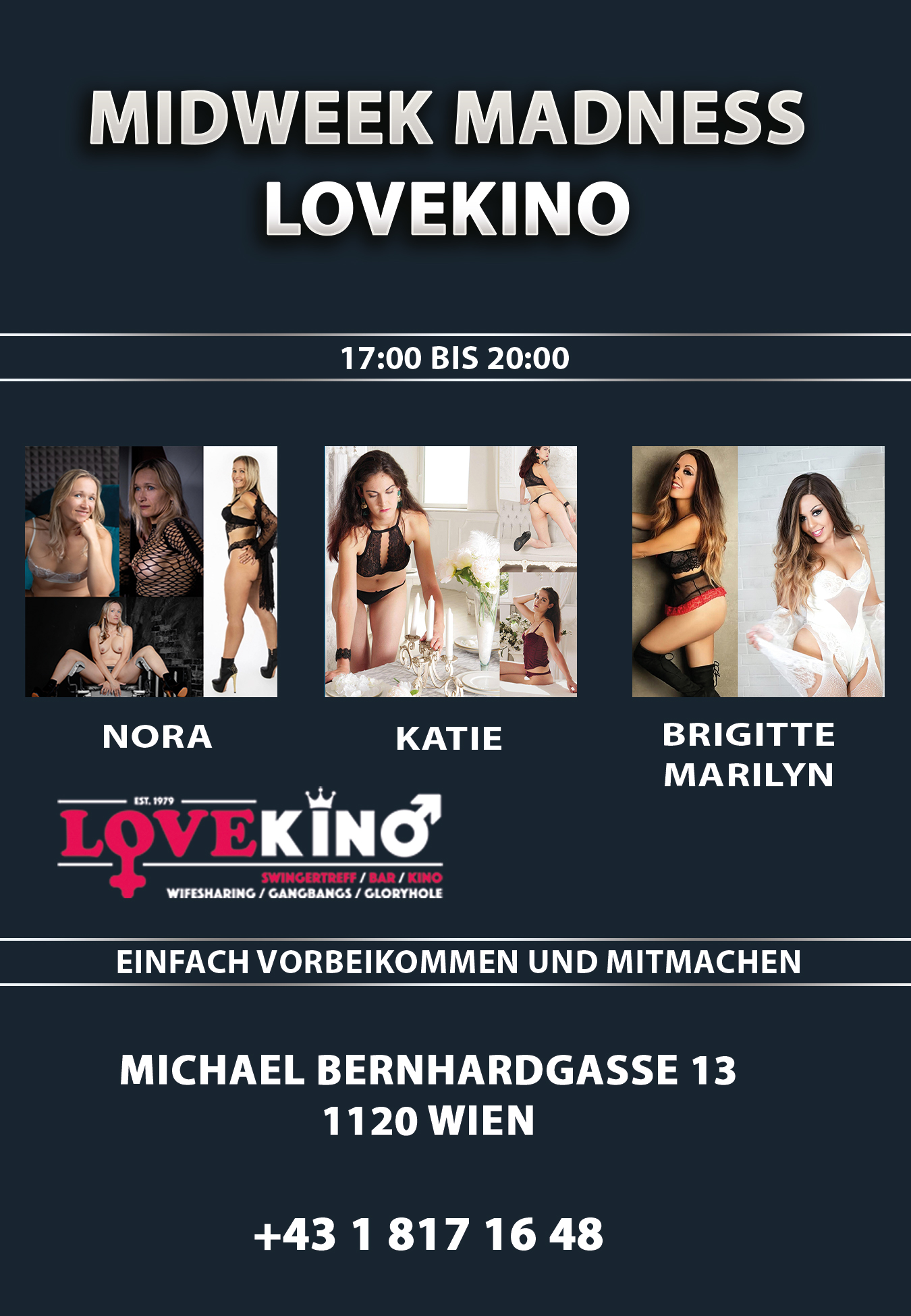 MITTWOCH - “Midweek Madness” Heute mit dabei sind: Eventbeschreibung: Mittwochabend – Zeit, den Kopf auszuschalten und den Körper entscheiden zu lassen. Midweek Madness im Lovekino ist der Treffpunkt für alle, die sich nicht mit Routine zufriedengeben. Denn Leidenschaft ist nicht nur ein Thema fürs Wochenende! 🔹 Getränkepauschale: regulär Gold-Member oder Online Anmeldung zum Termin Zugang zu allen Clubbereichen (kleines “Kino”, Gloryhole, Milking Table, The Round Room) Softdrinks & Kaffee, Music & Hardcore-Movies, Handtücher & Hygieneartikel Zielgruppe: Menschen mit Stil und Lust auf Mehr  Genießer, Entdecker und Grenzgänger reduzierte Anzahl an weiblichen Stammgästen Früh anmelden & Vorteile sichern! 📅 Melde dich mindestens 1 Tag vor dem Event an und erhalte 10 € Rabatt auf die Getränke-Pauschale Nutze diese Gelegenheit - früh anmelden lohnt sich! Zur Anmeldung bitte unten ausfüllen und absenden:  Hinweis für unsere Events:Damit wir besser planen können und alle Teilnehmer ein tolles Erlebnis haben, bitten wir euch, nur dann eine Anmeldung vorzunehmen, wenn ihr sicher teilnehmen könnt.Bei wiederholten Nichterscheinen ohne Absage können leider keine Vorteile (z. B. Rabatte oder Sonderaktionen) mehr gewährt werden. Vielen Dank für euer Verständnis und eure Fairness! ❤️ ⚠️ Hinweis: Das Lovekino wird nicht als Prostitutionslokal geführt. Alle Begegnungen erfolgen freiwillig und ausschließlich auf privater Basis zwischen […]